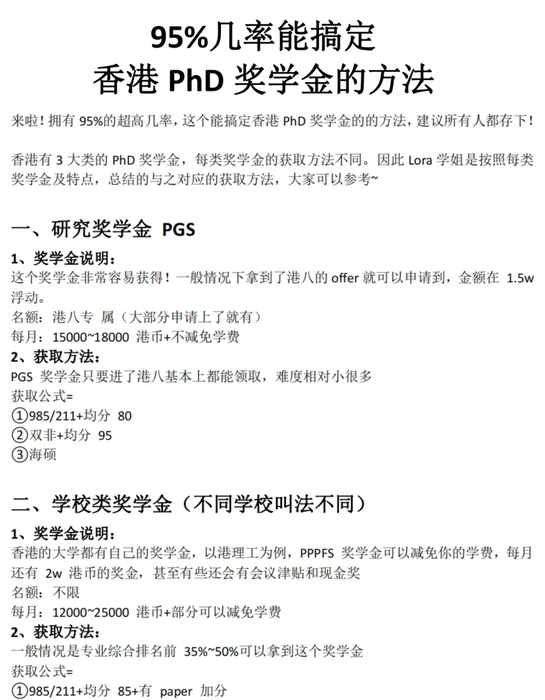 发现一个能显著提高香港博士奖学金申请成功率的方法,建议大家收藏!香港博士奖学金主要分为三大类,不同类型的奖学金申请方式各有侧重。本文将按照各类奖学金的特点,详细总结其申请攻略。1⃣研究奖学金 PGS🔹奖学金说明:该奖学金相对容易获得,通常在获得香港八校的录取通知后即可申请,金额约为每月1.5万港币。...[查看阅读]