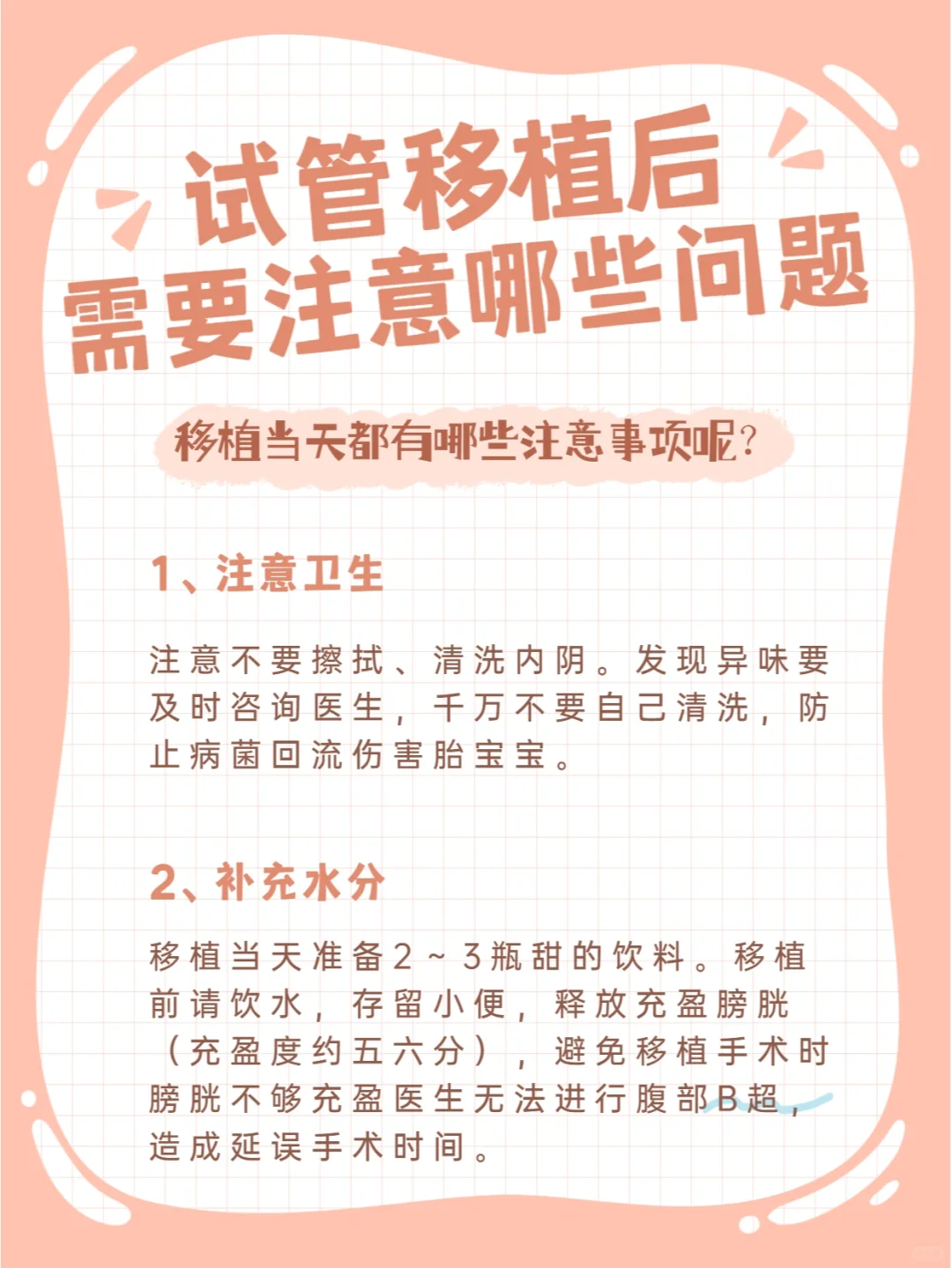 1、在进行试管助孕的移植手术前,注意保持外y清洁,移植前一天晚上可以洗澡。移植当天建议穿着宽松舒适的衣物,避免穿高跟鞋,当天不要化妆,也尽量不要使用有香味的护肤品及佩戴首饰,同时清洁好指甲,避免擦指甲油。2、手术当天的早餐避免食用产气的食物,例如牛奶、番薯、甜食等。积极做好心理准备,努力消除紧张情绪...[查看阅读]